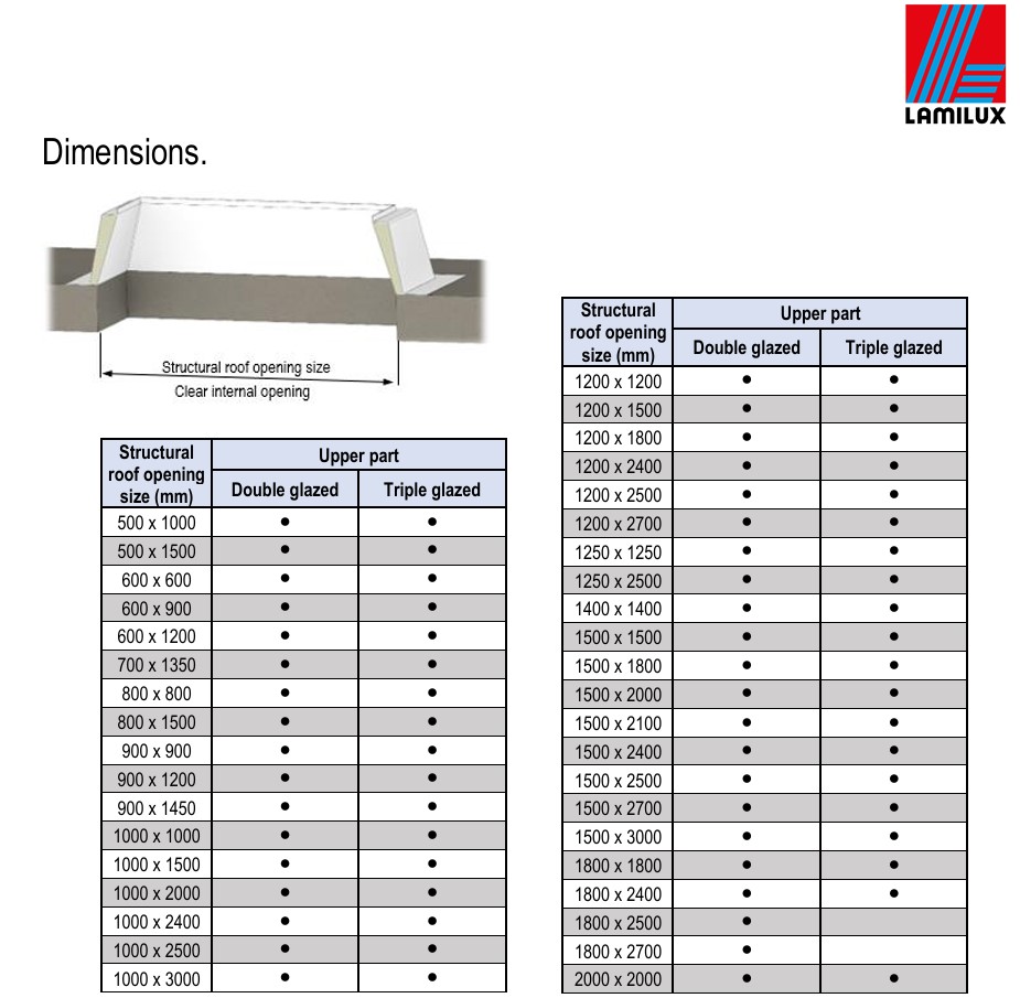 The Glass Skylight FE is available pre-assembled for quick installation, with 40 standard square and rectangular size options up to 3000mm in length. For unique projects, bespoke sizes can be supplied with a fit adapter to match your roof opening plans. Choose between double or triple glazing, and specify as either a fixed or opening rooflight. Download the 0° data sheet or 3° data sheet for detailed specifications